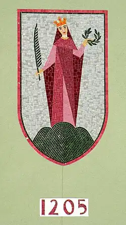 - „In einem silbernen Schild, auf einem grünen Dreiberg, stehend, die heilige Margaretha, die mit einem roten Gewand bekleidet ist, in ihrer rechten Hand einen grünen Palmzweig, in ihrer linken einen grünen Lorbeerkranz hält und auf ihrem Haupt eine goldene Krone trägt.“