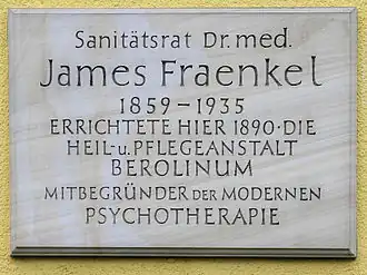 - ↑ Arbeitskreis Historisches Lankwitz (Hrsg.): Zum Gedenken an Sanitätsrat Dr. med. James Fraenkel 1859–1935. Über sein Leben und seine Heil- und Pflegeanstalt in Landwitz. Eigenverlag, Berlin 2001, S. 21.