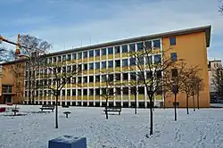 Das langgestreckte Gebäude wurde in den Jahren 1959 bis 1962 nach Plänen der Architekten G. Martens und H. Schönig errichtet. Die Rasterfassade ist klar gegliedert, bunte Keramikplatten schmücken die Fassade an den Kopfbauten. Das Treppenhaus zur Badenstraße zeigt Buntglas. Die Stahlbetonkonstruktion gilt als herausragendes Beispiel der Nachkriegsarchitektur in Stralsund. Der kubische Saalbau an der Westseite, zur Badenstraße Nr. 17 hin, der dem Komplex seinen L-förmigen Grundriss verleiht, wurde in den Jahren 1965 bis 1966 angefügt, er besitzt eine sehr große Fensterfläche.