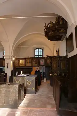 Um 1700 wurde in der Kapelle eine Orgelempore mit gedrehten Säulen und Gemälden an der Brüstung errichtet. Die heutige Kanzel mit Evangelistenfiguren und einer Heiliggeisttaube entstand Anfang des 18. Jahrhunderts.