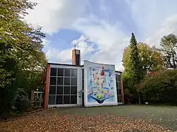 Der Eingang der Kirche liegt hinter einem Wandbild des Großhansdorfer Künstlers Siegfried Assmann Himmlisches Jerusalem (1998/1999). Dieses Motiv stammt aus der Offenbarung des Johannes und soll einen Zugang zum Heiligen Geist eröffnen. Zwölf nach außen offene Tore führen in die Stadt, wo Rot dominiert als Farbe der Liebe und des Zeugnisses des auferstandenen Christus. Hier gelangt der Mensch an das Ziel seines Lebens, in ihren Mauern ist er geborgen unter der Taube als Symbol für Frieden. Der Regenbogen, der sich über die Weltkugel spannt, zeigt die Treue Gottes. Der blaue Untergrund verweist auf das Wasser der Taufe. Feuerzungen gehen von der Stadt aus und bewegen sich auf die Welt zu. Es sind die Gaben des Heiligen Geistes: die Gabe der Weisheit, der Einsicht, des Rates, der Erkenntnis und der Stärke, der Frömmigkeit und der Gottesfurcht.[4] Auffälligerweise wird die Kirche so nicht durch große Doppeltüren betreten, sondern durch zwei kleinere Türen, rechts und links hinter dem Wandbild.