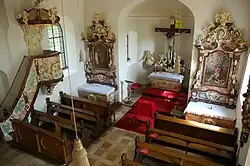 Die Seitenaltäre entstanden um 1760. Die Holzaufbauten sind mit einem Muscheldekorschnitzwerk versehen. Heute tragen die Seitenaltäre eine neuere farbkräftige Fassung. Das Gebälk wurde mit Engelsköpfen und Rocaillevasen geschmückt. Auf den Aufsatzkartuschen sieht man Embleme des Zimmerhandwerks und der Hirtenmusik; sie beziehen sich auf die Darstellungen der Altarblätter: die Heilige Familie und der Heilige Wendelin.