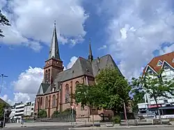 Hl. Kreuz wurde 1895 bis 1897 nach Plänen des Mainzer Dombaumeisters Ludwig Becker im Stil der Neugotik gebaut. Auffallend ist vor allem die Farbe der Steine, die in einem dunklen Sandsteinrot leuchten.