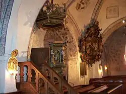 Die Kanzel und der Altar stammen aus dem 17. Jahrhundert und sind aus Holz.
