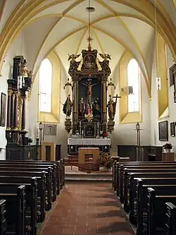 Der Hochaltar in seiner heutigen Ausführung stammt aus dem Jahr 1641. In der zentralen Nische, also oberhalb der Kreuzreliquie, befindet sich eine Kreuzigungsgruppe, im Auszug eine Darstellung von Gott Vater mit dem gleichseitigen Dreieck als Symbol der Heiligen Dreifaltigkeit. An der Nordwand des Altarraums befindet sich ein barocker Seitenaltar. Im Zuge der Kirchenrenovierung in den Jahren 2000 bis 2002 wurde der Altarraum durch den Bildhauer Werner Mally neu gestaltet. Neben dem neuen Volksaltar, der als offener Würfel mit kreuzförmigem Hohlraum ausgeführt ist, gehören dazu der Ambo, die Sedilien, der Tabernakel, die Taufschale, die Apostelleuchter und das Vortragekreuz.[1]