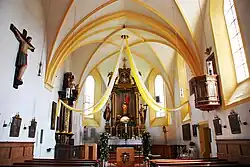 Der Innenraum wirkt trotz der geringen Anzahl an Fenstern hell und einladend. Das Presbyterium ist baulich nicht vom Langhaus getrennt, wie in vielen anderen Kirchen beispielsweise durch einen Chorbogen. Dadurch wird der Kirchenraum auch von einem einheitlichen, spätgotischen Kreuzrippengewölbe, das aus Konsolen in großer Höhe entspringt, überspannt. Die Gewölberippen sind, genauso wie die Lisenen rund um die Fensteröffnungen, gelb getüncht, während die Gewölberücklagen und die Seitenmauern in weißer Farbe ausgeführt sind. Im rückwärtigen Bereich des Kirchenschiffs ist eine doppelstöckige Holzempore eingezogen, die auf zwei Stützen links und rechts des Mittelgangs ruht. Auf Höhe des unteren Emporengeschosses befindet sich auf der Südseite ein zusätzliches kleines Fenster, im oberen Emporengeschoss ist die Orgel untergebracht. Während die untere Emporenbrüstung geschlossen ist, wurde die im oberen Geschoss untypischerweise als Balustrade ausgeführt.