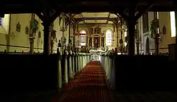 Der Altar wurde 1824 von Bildhauer Wilhelm Biereichel aus Rößel (polnisch Reszel) – möglicherweise unter Verwendung älterer Teile – geschaffen. Die Bilder stammen von Johannes Strunge, ebenfalls aus Rößel.[1] Die Kanzel entstand 1897, die Taufkammer aus dem zu Ende gehenden 17. Jahrhundert.[2] Zur Innenausstattung gehört eine Skulptur der Mutter Gottes mit Kind im Altar von etwa 1410, außerdem eine achteckige Taufschale aus Messing von 1664.[1] In der Turmhalle befindet sich ein Weihwasserbecken aus Granit aus dem 15. Jahrhundert.
