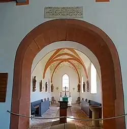 Über die erste Kirche, ein Gebäude aus Holz, gibt es fast keine Überlieferungen. Sie wurde vermutlich um die Zeit der Kolonialisierung des ehemals slawischen Gebietes gegründet. Über dem schlichten Hauptportal der heutigen Kirche ist die Jahreszahl 1014 zu sehen.[4] Der älteste noch erhaltene Gebäudeteil der Kirche ist der romanische Chorturm aus der zweiten Hälfte des 12. Jahrhunderts östlich des Schiffs. Er hat drei Geschosse und ist fast doppelt so lang wie breit. Der Altarraum im unteren Turmgeschoss ist mit einem spätgotischen Kreuzrippengewölbe von zwei Jochen. gedeckt. Die Rippen ruhen auf steinernen Tier- und Menschenköpfen. Die Schlusssteine zeigen ein Lamm und einen Christuskopf.[5] Bei der Renovierung im Jahr 1959 wurden Malereien aufgedeckt; sie zeigen an den Wänden alte Weihekreuze und im Gewölbe ornamentale Pflanzenmalereien. Der Altarraum wird vom Schiff durch einen romanischen Triumphbogen ohne Kämpfer getrennt. Das Schiff wurde nach einer Bezeichnung im Triumphbogen um 1681 gebaut. Die flache Decke des einfachen rechteckigen Raumes wird von zwei schlanken Holzpfeilern gestützt, was diese Kirche zu einer Hallenkirche macht. Die Fenster haben nach innen Segmentbögen, sind aber nach außen hin rechteckig. Jede der drei Außenwände hat in der Mitte eine schlichte Tür.[6] An der West- und der Nordseite befinden sich Emporen, die von Bügenpfeilern gestützt werden, ohne Verbindung zu den Deckenpfeilern.[7] Bei der Renovierung von 1826 bis 1827 wurde der Chorturm um zwei Geschosse in Backstein erhöht. Der mit Stützpfeilern versehene Chorturm ist stark eingezogen, seine Wände sind durch Fenster aus unterschiedlichen Epochen gegliedert.[8]
