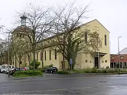 Der Kirchenbau ist eine dreischiffige Basilika mit Satteldach und seitlich integriertem rechteckigem Turm mit Walmdach und hoher Laterne. Der Putzbau mit einem Löwenportal zeigt Kalksteingliederungen und trägt an der Hauptfassade das Bild Kreuzeserhöhung durch Kaiser Konstantin von Willy Jakob aus dem Jahre 1935 in Sgraffito-Technik.
