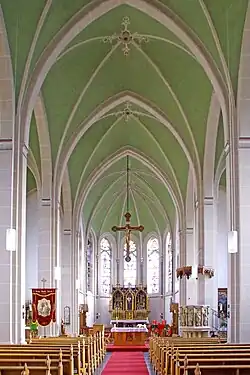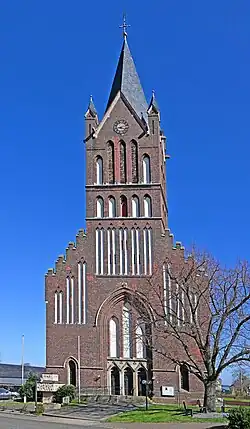Die an der Zehnthofstraße gelegene Backstein-Hallenkirche mit Chor mit 5/10-Schluss und Einturmfassade wurde 1900 bis 1903 nach Plänen des Architekten August Rincklake in der ortsuntypischen Form der norddeutschen Backsteingotik errichtet und am 9. Juni 1904 durch den Kölner Weihbischof Joseph Müller geweiht.[1] Im Zweiten Weltkrieg wurden Kirche und Ausstattung erheblich beschädigt, 1978/1979 die neugotischen Ausstattungsstücke (Hochaltar, Kanzel, Gestühl) restauriert und ab 1981 umfassende Sicherungs- und Erneuerungsarbeiten durchgeführt.
