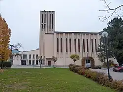 Die Kirche wurde 1954/55 nach Plänen von Thomas Wechs erbaut. Sie besteht aus einem Langhaus, einem eingezogenen Chor im Osten und einem Kirchturm an der Nord-West-Ecke des Langhauses. Die Flachdächer des Langhauses und des Chors bestehen aus Spannbeton-Fertigdecken. Die Orgel wurde 1982 von der WRK Orgelbau gebaut.[1]