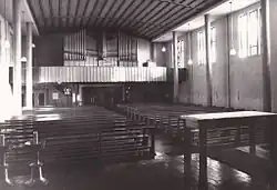 Auf Basis eines Vorprojektes von Architekt Anton Higi entwarf Karl Strobel einen schlichten Kirchbau, der sich auf einem Baugrund zwischen der ruhigeren Brunnwiesen- und der verkehrsreichen Limmattalstrasse in der Nähe des damaligen Postgebäudes und des Schulhauses Bläsi in Höngg befand. Das Dach der Kirche zierte ein Dachreiter für eine Glocke. Geplant war, diesen Dachreiter durch einen schlanken Kirchturm zu ersetzen und das südliche Gelände an der Limmattalstrasse durch ein neues Pfarrhaus zu bebauen, was aber beides nicht ausgeführt wurde. Die zweigeschossige Kirche war längs der Brunnwiesenstrasse erbaut und teilte die nach Südwesten fallende Liegenschaft in zwei verschieden hoch gelegene Geländestufen. Der höher gelegene Teil an der Brunnwiesenstrasse bildete den oberen Kirchenvorplatz, der untere Kirchplatz bot Raum für den Aussenbereich des kirchlichen Kindergartens, der ursprünglich im Untergeschoss der Kirche angesiedelt gewesen war. Im Untergeschoss des Kirchengebäudes befand sich auch eine Werktagskapelle mit eigener Sakristei. Durch eine Treppe konnte man von der unteren Sakristei in die obere Sakristei gelangen. Das Obergeschoss des Gebäudes bestand aus der eigentlichen Kirche. Der Kirchenraum war durch einfache Betonsäulen gegliedert und mit einer leicht gewölbten, gleichförmig über Chor und Schiff durchlaufenden Holzdecke überspannt. Dreiteilige Fenster spendeten Licht und enthielten Glasfenster des Kunstmalers Giuseppe Scartezzini. Das offene und erhöhte Chor wurde durch die Kanzel und die Kommunionbank vom Kirchenschiff abgehoben. Der Altar bestand aus einem Verde-Issorie-Marmor. Die Tabernakelverkleidung und die Altarleuchter waren von Goldschmied O. Zweifel entworfen und ausgeführt worden. Im hinteren Bereich der Kirche befand sich eine Orgelempore, welche in Holz als Provisorium ausgeführt war, da man ursprünglich geplant hatte, die Kirche in einer zweiten Bauetappe um ein Joch nach rückwärts zu verlängern, was dann aber nie ausgeführt wurde.[13]
