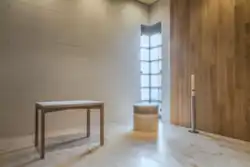Da die Kirche keine grossen Fenster aufweist, fällt das Tageslicht hauptsächlich durch grosse Lichtschächte von der Decke in die Kirche. Um deutlich zu machen, dass der Kirchenraum mit einer Schiebewand in einen sakralen und in einen profanen Raum getrennt werden konnte, wurden in der linken Kirchenhälfte dezente Lampen in den Lichtschächten angebracht, in der linken Saalhälfte hingen jedoch grosse, kugelförmige Leuchtkörper von der Decke herab. Die Einheit des ganzen Raumes wurde dagegen durch den hellen Steinboden betont, der aus Jurakalkstein besteht und Einschlüsse versteinerter Ammoniten u. a. enthält.