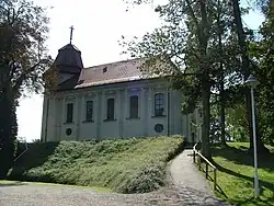 Die 1712 nach einem Entwurf von Johann Georg Fischer gebaute Saalkirche besteht aus einem Langhaus mit fünf Fensterachsen, deren Wände mit Pilastern gegliedert sind, und einem sechsseitigen Chorturm im Süden. Der Innenraum des Langhauses ist mit einer Flachdecke überspannt. Der Chor im Erdgeschoss des Chorturms schließt dreiseitig. Zur Kirchenausstattung gehört ein Hochaltar, auf dem sich eine Kreuzigungsgruppe befindet.