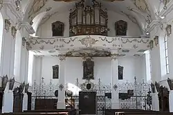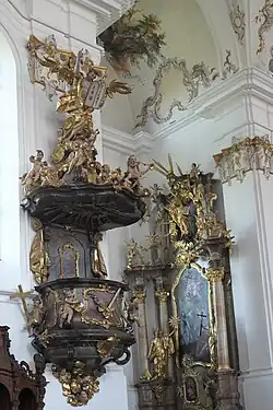 - Der 1758 eingebaute Hochaltar und die 1759 aufgestellten Seitenaltäre wurden wie die 1757 angefertigte Kanzel von Jakob Steinle nach Entwürfen von Johann Michael Fischer ausgeführt, der auch die Assistenzfiguren schuf.