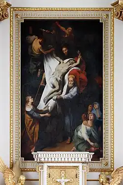Die geostete Pfarrkirche hat einen Hochaltar aus den 1930er Jahren, der vom Münchner Bildhauer Hans Miller entworfen und durch die Schreinerei Hörmann in Babenhausen gefertigt wurde. Pfarrer Josef Weidemann ließ die neo-romanische Altar-Mensa verkleinern und einen Aufbau für den Altar anfertigen. Neben dem Kruzifix aus der Erbauungszeit der Kirche befinden sich jeweils paarweise Säulen, die jeweils außen von Statuen der Apostel Petrus und Paulus aus dem Ende des 17. Jahrhunderts umrahmt werden. Das Altarblatt Konrad Hubers zeigt Josef von Arimathäa, der den Leichnam Jesu am Abend des Karfreitags im Kreis von Männern, trauernden Frauen und der die Arme ausbreitenden Maria Magdalena vom Kreuz herabstützt. Im Auszug des Hochaltars befindet sich die 1938 von Josef Brenner geschaffene Figur von Papst Urban I., dem Patron der Vorgängerkirche, die ihn mit einer Weinrebe in der rechten Hand als Patron der Winzer ausweist.[3] Das aus den 1790er Jahren stammende klassizistische Chorgestühl von Fidelis Mock aus Sigmaringen wird jeweils von einem Relief bekrönt. Im Norden erkennt man den heiligen Leonhard von Limoges, im Süden den frühchristlichen Märtyrer Sebastian.