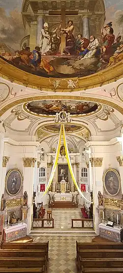 Die Deckenfresken illustrieren das Thema „Heiliges Kreuz“. Vor dem Chorbogen ist die Auffindung und Identifizierung des Heiligen Kreuzes durch Kaiserin Helena zu sehen. Sie blickt neben dem Jerusalemer Bischof Makarius auf das Kreuz, an dessen Stamm sich ein verstorbener Jüngling aufrichtet. Links im Hintergrund zerstören drei Männer ein heidnisches Götterbild. Den Chorbogen ziert das Wappen des Erbauers Abt Gilbert Scheurle. Das kreisrunde Hauptfresko mit dem Leitmotiv der Kreuzerhöhung trägt am östlichen Rand die Signatur „CONRAD HUBER pinx. 1786“. Es zeigt große Ähnlichkeit mit dem Fresko von Januarius Zick in der Klosterkirche Wiblingen. Abgebildet ist die Wiederaufrichtung des Heiligen Kreuzes nach dessen Rückeroberung aus der Hand der Perser im 7. Jahrhundert durch Kaiser Heraklius auf dem Altar der Grabeskirche. Vor dem Kreuz kniet Kaiser Heraklius ohne Machtinsignien, während sich das einfache Volk um die Szene schart. Die vier in Grisailletechnik gemalten Medaillons in den Ecken sind ein Verweis auf die Besinnung der in der Wüste gegenüber Mose murrenden Israeliten im Zuge der von Gott gesandten Giftschlangen (vgl. Num 21,4–9 ).