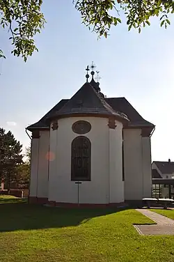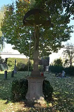 Neben der Kirche befindet sich der katholische Friedhof. Darauf befindet sich ein Wegekreuz. Eigentlich sollte dies an der Straße gegenüber der Kirche aufgestellt werden. Dagegen richtet sich der Protest der lutheranischen Bevölkerung. Landgraf Wilhelm VIII. von Hessen-Kassel verbot die Aufstellung 1764 per Dekret. Die Katholiken stellten das Kreuz daher auf dem Friedhof auf.