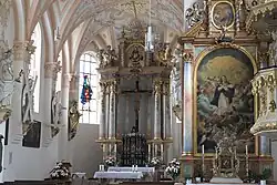 Das romanische Kreuz ist in den Hochaltar von 1611 integriert. Der hölzerne Tabernakel stammt aus dem Jahr 1700; er ist aus dunklem Holz und reich mit Silber verziert. Der rechte der beiden Seitenaltäre von 1620 trägt ein Gemälde von der Himmelfahrt Marias, ein Werk Johann Matthias Kagers; am linken ist die Beweinung Christi dargestellt. Figuren von Christus, Maria, und den Aposteln an den Wänden werden auf 1620 oder 1672 datiert. Die Kanzel stammt aus dem Jahr 1746. Die Bilder der Kreuzwegstationen schuf Wenzeslaus Albert 1769.