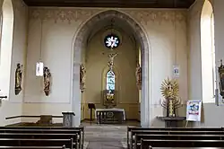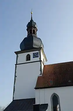 Der spätgotische Chorturm ist im Kern aus dem 14. Jahrhundert. Seine Welsche Haube erhielt er im ersten Viertel des 17. Jahrhunderts. Sein oberstes Geschoss beherbergt die Turmuhr und den Glockenstuhl. An ihn wurde 1851 das neugotische Langhaus nach Westen angebaut, das mit einem Satteldach bedeckt ist. Die Fassade im Westen wurde aus Quadermauerwerk errichtet. Das mit einem Kielbogen bedeckte Portal wird von zwei Pilastern eingerahmt, auf denen Fialen sitzen. Der Innenraum des Langhauses ist mit einer Kassettendecke überspannt. Auf der Empore gegenüber dem Chor steht die Orgel mit 16 Registern auf zwei Manualen und Pedal, die 1916 von G. F. Steinmeyer & Co. gebaut wurde.[1]