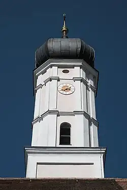 Im nördlichen Chorwinkel steht der mit einer Zwiebelhaube gedeckte Glockenturm. Er besteht aus einem quadratischen Untergeschoss und einem oktogonalen Aufbau, der durch Gesimse und Blendfelder gegliedert und von rundbogigen Klangarkaden durchbrochen wird. Das Portal ist in ein Vorzeichen an der Westfassade des Langhauses integriert.