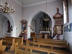Das Hauptschiff ist flach gedeckt und das Seitenschiff ist mit einem Kreuzgewölbe versehen. Das Seitenschiff ist mit zwei Rundbogen abgetrennt. Ein Spitzbogen trennt den Chor, der ein Holztonnengewölbe besitzt, vom Kirchenschiff.