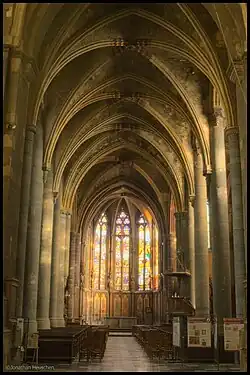 Der Westchor ist im romanisch-gotischen Übergangsstil gestaltet (Ende 12., Anfang 13. Jahrhundert) und zeigt die Auffindung des Heiligen Kreuzes von Bertholet Flémal (17. Jahrhundert). Die östliche Apsis stammt aus dem 13. Jahrhundert, die Kirchenschiffe aus dem 13. und 14. Jahrhundert und die Seitenkapellen aus dem 15. Der mit Wandmalereien von Jules Helbig geschmückte Chor enthält bemerkenswerte Glasmalereien von Jean-Baptiste Capronnier und Eugène-Stanislas Oudinot.