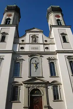 Die Kirche ist im Barockstil nach Vorarlberger Schema aus Stein erbaut. Die Länge beträgt 45 m, die Breite des Kirchenschiffs 18 m. Ihr Äusseres wird durch zwei markante, kuppelbedeckte Türme von 47 m Höhe im Osten sowie den Chorturm im Westen bestimmt. Die Kirche fasst 350 Personen im Schiff und 60 auf den Seitengalerien.[1]