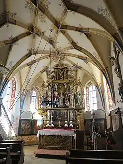 Der 1682 gebaute Hochaltar wird von den Skulpturen der heiligen Helena und der Barbara von Nikomedien flankiert. Im Altarretabel ist die Krönung Mariens dargestellt. Die Kanzel aus dem 17. Jahrhundert wurde später überarbeitet. Im Chor befinden sich vier Tafelbilder, die Jan Polack zugeschrieben werden.