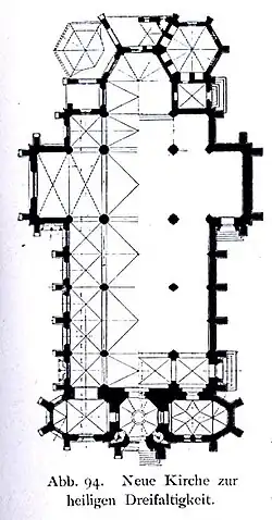 Den östlichen Abschluss des Kirchenbaus bildeten drei Chöre, wobei der mittlere Chor polygonal und die beiden anderen rechteckig abschlossen. Um den Chor gruppierten sich niedrigere Sakristeien. Neben dem Hauptturm bildeten zwei weitere Kapellen den westlichen Abschluss des Kirchenbaus. Diese waren polygonal abgeschlossen und wurden quer zur Längsachse des Kirchenschiffs angeordnet.