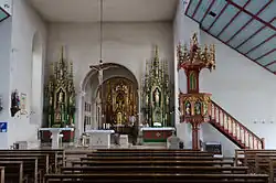 Das Langhaus ist südlich und nördlich um zwei Seitenschiffe mit Pultdach erweitert. Der Chorturm mit spitzbogigen Schallfenstern und Zwiebelhaube geht über in den östlichen Fünfachtel-Chorschluss. Im Chor befindet sich eine spätgotische Sakramentsnische. Die Einrichtung der Kirche ist neugotisch. Am Hochaltar ist die Dreifaltigkeit dargestellt, an den Seitenaltären erkennt man Figuren der Muttergottes (rechts) und des heiligen Josef (links). Die Kanzel ist mit Figuren der vier Evangelisten versehen. Das Geläut besteht aus vier Glocken. Sie sind dis´, fis´, gis´ und ais´ (vertieft) gestimmt.