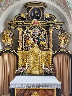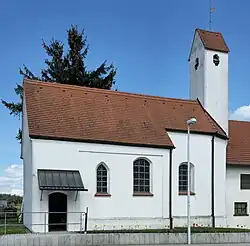 Die 1612 erbaute Kirche ist eine Stiftung des reichen Roggensteiner Bauern Hans Schädel, der 1612 mit seinem Fuhrwerk über die Wurzeln eines mächtigen Baumes stürzte. Der Unfall verlief glimpflich und ein kreuzförmiges Wurzelwerk wurde freigelegt, weshalb sich der Bauer zu seiner Stiftung entschloss.