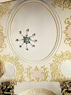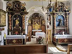 Der reiche spätbarocke Akanthusstuck aus der Zeit um 1705 bis 1713 im flachgedeckten Langhaus, im kreuzgewölbten Chor und am Chorbogen stammt von Benedikt Heiß. Die einstmaligen Freskenfelder sind weiß übertüncht. Der Hochaltar von 1690 und die an den Chorbogen gestellten Seitenaltäre von etwa 1695 werden dem Dachauer Kistler Franz Prugger zugeschrieben, die skulpturale Ausstattung stammt von dem Landsberger Bildhauer Lorenz Luidl. Der Hochaltar wird durch den überdimensionierten Tabernakel aus der einstmaligen Pfarrkirchenausstattung Oberweikertshofens geprägt. Bei dessen Übernahme wurden die Säulen ab der Mitte gekappt und Luidls Marienkrönungs-Hochrelief mit der Heiligen Dreifaltigkeit, das früher weiter nach unten reichte, gekürzt. Seitlich stehen über den Durchgängen die Apostelfürsten Petrus und Paulus. Im Auszug befindet sich die Büste des heiligen Leonhard. Die Seitenaltäre sind den Heiligen Bartholomäus (mit dem Messer wurde ihm bei lebendigem Leibe die Haut abgezogen) links und Franz von Assisi (mit der Vision in der Anbetung des Kreuzes, bei der er die Stigmata empfing) rechts gewidmet. Die Kanzel schuf 1693 wiederum Franz Prugger. An den seitlichen Chorwänden sind Figuren der Heiligen Johannes der Täufer und Sebastian aufgestellt, die ebenfalls von Lorenz Luidl stammen. Das Kruzifix mit Mater Dolorosa ist eine Arbeit vom Anfang des 18. Jahrhunderts eines nicht zu ermittelnden Künstlers.