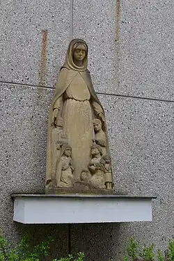 Auf dem Vorplatz der Kirche, am Giebel des Geschäftshauses Groß, steht die Figur einer Schutzmantelmadonna, die unter der Ägide von Pfarrer Alois Kneip in Auftrag gegeben wurde und eine im Zweiten Weltkrieg zerstörte Marienfigur ersetzen sollte. Sie gehört zu den frühen Arbeiten, die der aus dem Sudetenland stammende und in Lebach wohnende Bildhauer Ernst Brauner (geboren 1917 in Oberlipka bei Grulich im Sudetenland, Österreich-Ungarn, jetzt Horní Lipka, Králíky, Tschechien; gestorben 1979 in Lebach-Landsweiler) für die Saarregion, in der er sich 1955 als Künstler selbständig gemacht hatte, schuf. Unter dem weiten, ärmellosen Mantel der Gottesmutter Maria, den sie über ihrem gegürteten Gewand trägt, staffeln sich in Bedeutungsperspektive verkleinert wiedergegebene, um Schutz flehende Menschen verschiedenen Alters und Geschlechts. Ein stehender Kleriker mit geradem Blick hält in seiner Hand ein Kirchenmodell, eine Nonne ist in stiller Andacht versunken, ein stehender Mann, vielleicht ein Bergmann, hält eine Grubenlampe, ein kleines Mädchen hat die Augen niedergeschlagen und die kleinen Hände zum Gebet gefaltet, eine junge Mutter kniet mit ihrem kleinen Kind flehend vor der Madonna, zu deren Füßen ein Krug und ein Ährenbündel niedergelegt sind. Der mitleidsvolle Blick Mariens wendet sich den Schutzsuchenden zu. Die Skulptur wurde aus Metzer Kalkstein (Jaumont-Stein) gemeißelt, der sich durch seinen goldgelben Farbton auszeichnet. Sie lehnt sich ikonografisch und formal an mittelalterliche Figuren dieses Typus an.[44][45]