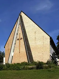 Die in rund 140 Meter Höhe über dem Meeresspiegel gelegene turmlose Kirche wurde nach Plänen von Josef Fehlig erbaut.[2]