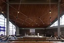 Die Sakristei und die „Werktagskirche“ für kleinere Gottesdienste befinden sich in einem direkt anschließendem flachen Anbau. Die Kirche bietet in der Hauptkirche ca. 450 (in drei Blöcken rund um die Altarzone angeordnet) und in der Werktagskirche ca. 65 Sitzplätze. Die Hauptkirche verfügt über zwei Eingänge, die Werktagskirche über einen separaten Eingang. Am linken Eingang befindet sich leicht erhöht der Orgel- und Chorbereich.