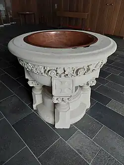 Das Taufbecken aus der alten Kirche ist erhalten geblieben und wurde 2008, nach einer fachmännischen Restaurierung, seinem ursprünglichen Nutzen zugeführt. Es steht heute im Nebenraum, in der „Werktagskirche“.[4]
