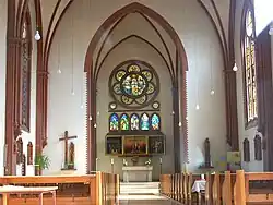 Die Pfarrkirche besitzt außer den neugotischen Fenstern aus Bückgen einige bemerkenswerte zeitgenössische Skulpturen. Als bedeutendste Kunstwerke gelten jedoch der Altar und die Chorfenster von Sieger Köder. Die Fenster zeigen fünf Elternpaare, denen Schlüsselrollen in der biblischen Heilsgeschichte zukommen:[2]
