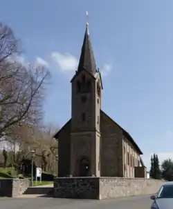 Um die Wende vom 19. zum 20. Jahrhundert wurde die neuromanische Saalkirche aus Bruchsteinen erbaut, die 1903 geweiht wurde und das Patrozinium Heilige Familie erhielt. Sie hat einen mit einem achtseitigen, spitzen, schiefergedeckten Helm bedeckten Kirchturm im Westen, ein Kirchenschiff und eine rechteckige Apsis, die ursprünglich polygonal war. Das Kirchenschiff und der Turm, dessen oberstes Geschoss Triforien als Klangarkaden hat, sind mit Lisenen und Bogenfriesen gegliedert. Die Kirchenausstattung aus der Bauzeit ist weitgehend erhalten. Die Orgel mit 7 Registern wurde 1936 von den Gebrüdern Späth gebaut.[1]