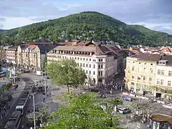 | Die zwei Gipfel des Heiligenbergs neckaraufwärts gesehen, im Vordergrund Neuenheim | |