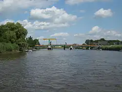 Blasonierung: „In Silber über blaugewelltem Schildfuß eine rote Klappbrücke, zwischen deren aufgezogenen Hälften der Bug eines einmastigen roten Bootes sichtbar wird.“[7]
