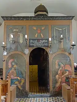 Aschau im Chiemgau: 1797/99 fertigten der Kistler Sebastian Furtner aus Hohenaschau und der Maler Sebastian Rechenauer d. Ä. aus Unterflintsbach ein neues Heiliges Grab für die Aschauer Pfarrkirche. Die Künstler ließen sich von römischen Vorbildern inspirieren und standen noch ganz in der Tradition barocker Kulissenheiliggräber, in denen religiöse Inhalte in theatralischer Weise zum Ausdruck gebracht wurden. Drei Etagen in dem fast 10 m hohen Aufbau sind zu unterscheiden: In der Mitte das Heilige Grab, flankiert von Säulenhallen, die den Blick in Landschaftsmalerei freigeben. Es ist die irdische Ebene, die Welt mit all ihrer Schönheit (dargestellt beispielsweise in der Landschaft und der Harmonie der Säulenarchitektur), aber auch ihrer Vergänglichkeit (Grab). Darüber ist der himmlische Bereich mit den drei göttlichen Tugenden und der Nische für die Monstranz (so früher) bzw. dem Kreuzreliquiar, sowie für die Figur des Auferstandenen an Ostern. Die unterste Ebene stellt die Unterwelt dar mit den Verstorbenen der vorchristlichen Zeit, angefangen bei Adam und Eva, die auf Erlösung warten. Flankiert wird dieser Bereich von Ruinenarchitektur. In der Fastenzeit 2025 wird das Heilige Grab wieder in der Pfarrkirche in Aschau im Chiemgau aufgestellt.[25] mk-online.de: Aufbau Heiliges Grab in Aschau im Chiemgau 2019 auf YouTube, 28. Februar 2019, abgerufen am 9. März 2025. mk-online.de: Aschauer Auferstehungsspiel - Heiliges Grab Aschau im Chiemgau 2019 auf YouTube, 27. März 2019, abgerufen am 9. März 2025.