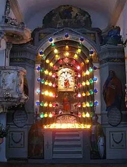 Kiefersfelden:Heiliges Grab Kiefersfelden Seit 1809 wird vor der Karwoche in der alten Pfarrkirche Heilig Kreuz von Kiefersfelden das Heilige Grab aufgestellt. Wie auf der Rückseite der obersten Holztafel vermerkt, hat die Theatergesellschaft von Kiefersfelden das Heilige Grab gestiftet. Auf dem Spielplan des seit vierhundert Jahre bestehenden Volkstheaters standen zu jener Zeit Bibelspiele, Parabelstücke und Heiligenlegenden. Das Heilige Grab von Kiefersfelden zeugt mit seinem kulissenartigen Aufbau von der barocken Freude an der bildlichen Darstellung geistlicher Ereignisse. Etwa 130 von rückwärts beleuchtete, in blau, grün, gelb, orange, rot und violett schillernde Glaskugeln tragen zur ganz besonderen Stimmung bei. Entsprechend kunstvoll ist der bühnenartige Aufbau des Hl. Grabes von Kiefersfelden gestaltet. Bemalte Holztafeln bilden die Kulisse aus fünf Bögen. Die schaffen die Illusion einer Raumtiefe hinein in die Grabhöhle. Das gesamte Heilige Grab ist ein Sinnbild des Kreuzestodes Christi und des Sieges über den Tod in der Auferstehung. Hinter sieben kulissenartigen Ebenen, beleuchtet von den verschiedenfarbigen Schusterkugeln, liegt unten im Grab der Leichnam des Gekreuzigten, darüber ein Bild der Schmerzensmutter. Am Ostersonntag erscheint dann am oberen Ende die Figur des Auferstandenen. An der Rückwand der Kulissen befindet sich die Jahreszahl 1809, die Tradition dieses Grabes geht aber sicher auf die Barockzeit zurück. Hergestellt und bemalt wurde das Heilige Grab durch den Tischlermeister und Maler Josef Kronthaler aus dem benachbarten Erl in Tirol. 1959 wurde es vom Schreiner Franz Schmid und dem Malermeister Konstantin Hahn aus Kiefersfelden grundlegend restauriert. 2009 wurde die Bemalung durch die Gebrüder Albrecht und Constantin Hahn ausgebessert. Albrecht Hahn schnitzte einen neuen auferstandenen Heiland, passend im barocken Stil. Notwendige Restaurierungsmaßnahmen des Hl. Grabes werden zu gleichen Teilen aus dem Gemeindehaushalt und von der Theatergesellschaft Volkstheater Ritterschauspiele Kiefersfelden finanziert. Die ursprüngliche Tradition eines Heiligen Grabes in Kiefersfelden geht noch weiter zurück als das heutige Altarkunstwerk. Bereits 1696 hatte die Besitzerfamilie des damaligen Schmelz- und Eisenwerk Kiefersfelden, die Grafen Fieger, der alten Ortskirche Hl. Kreuz ein Grabkunstwerk gestiftet.[29] rfo - Regional Fernsehen Oberbayern: Über 200 Jahre Heiliges Grab in Kiefersfelden, 29. März 2024, abgerufen am 12. April 2025