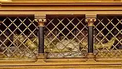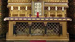 Wegberg: Unter der Mensa des Seitenaltars im südlichen Seitenschiff befindet sich das aus Holz geschnitzte Heilige Grab. In einer aus geschichteten Steinen gebildeten Höhle liegt der Leichnam Christi auf einem Leichentuch. Während des Jahres ist das Heilige Grab durch eine Blende mit Schnitzwerk verdeckt. In der Karwoche wird diese am Karfreitag und Karsamstag entfernt und gibt den Blick frei.[39]