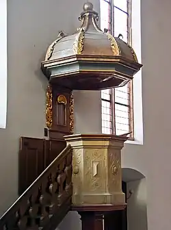 Die Kanzel wurde an der vierten Seite montiert. Sie besteht aus einem Kanzelkorb aus Sandstein, der zur Dekoration mit reichem Beschlagwerk der deutschen Renaissance geschmückt wurde. Kanzeldeckel und Kanzelrückwand stammen von 1707. Der Kanzeldeckel, eine achteckige Zwiebelkuppel ist an den Kanten mit vergoldetem Laubwerk belegt. Obenauf ist eine Weltkugel mit Kreuz angebracht. Die Kanzelrückwand ist mit vergoldetem Schnitzwerk in Form von Muscheln und Akanthusblättern geschmückt.[9]