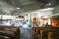 Die Kirche ist als polygonaler Querraum gestaltet, sodass sich die Gläubigen auf den Bänken im Halbkreis nahe um den Volksaltar versammeln. So werden die Vorgaben der Liturgiekonstitution des Zweiten Vatikanischen Konzils umgesetzt. Der Innenraum besteht wie die Aussenhülle aus unbearbeitetem Sichtbeton. Das Tageslicht dringt nur spärlich durch quadratische Fensteröffnungen in den Mauern und im Flachdach ins Kircheninnere. Weitere Maueröffnungen lassen das Licht nur indirekt durch einen Schacht in die Kirche einfallen. Die Decke des Kirchenraumes wurde gestaffelt gestaltet, sodass sie sich zur Kirchenmitte hin etwas senkt. Im Gegenzug hebt sich der Boden zum Altarbezirk hin um eine Stufe an, was dessen Bedeutung unterstreicht. Wie beim Kirchturm ist auch an der Chorwand aus dem Beton ein grosses Kreuz herausgearbeitet. Auf diesem ist ein Holz-Corpus angebracht. Das Kreuz bildet zudem einen der Pfeiler des Raumes, der zusammen mit den anderen 12 Pfeilern die Kirchendecke trägt. Während die übrigen 12 Pfeiler für die Apostel stehen, was durch die Apostelkreuze an den Pfeilern im Kirchenumgang verdeutlicht wird, symbolisiert der andersartig gestaltete Pfeiler mit dem Kreuz Jesus Christus selbst. Im Altarbezirk ist oberhalb des Kreuzes das Ewige Licht angebracht, der Tabernakel befindet sich am Pfeiler rechts des Kreuzes. Links des Altars ist der Ambo aufgestellt, daneben der Taufstein, der wie der Altar die polygonale Gestaltung des Kirchenraums aufgreift. Im Kirchenumgang sind schliesslich an der Aussenwand quadratische Kreuzwegstationen in Gestalt von Bildtafeln eingelassen, die von Förderers Schüler Rick aus der Staatlichen Akademie der Bildenden Künste Karlsruhe gefertigt wurden. Eine weitere Besonderheit der Kirchenbauten von Walter M. Förderer ist die Gestaltung der Sängerempore als abgegrenzter Bezirk, in dem die Orgel in eine Wandnische eingelassen ist. Beim Aufgang zu dieser Empore befindet sich der Eckstein. Seine Oberfläche ist mit einem Relief aus Quadraten besetzt, was wiederum die Gestaltung der Fensteröffnungen aufnimmt. Die daneben angebrachte Statue der gekrönten Madonna mit Kind ist im Stil des süddeutschen Barocks gehalten und wurde der Gemeinde anlässlich der Kirchweihe 1969 geschenkt.[23]