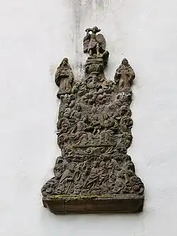 Die Kapelle wurde 1792 erbaut. Sie besteht aus einem Langhaus und einem eingezogenen, rechteckigen Chor im Osten. Aus dem Satteldach des Langhauses erhebt sich im Westen ein quadratischer, schiefergedeckter, mit einer Zwiebelhaube bedeckter Dachreiter, hinter dessen Klangarkaden eine Kirchenglocke hängt. Über dem Portal in der Fassade im Westen hängt ein Sandsteinrelief des Vorgängerbaus. Es zeigt die Heilige Dreifaltigkeit und wird von dem Heiligen Michael zwischen Figuren der Heiligen Monika und Franziska bekrönt. Aus der Pfarrkirche wurde eine Ädikula mit der Darstellung der Kreuzigung übernommen.