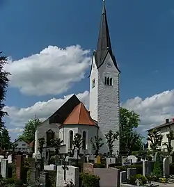 Die Saalkirche wurde im Kern im 15. Jahrhundert erbaut. Sie besteht aus einem Langhaus, das um 1730 erweitert wurde, einem eingezogenen, dreiseitig geschlossenen Chor im Osten und einem Chorflankenturm auf quadratischem Grundriss an der Nordwand des Chors, dessen untere Geschosse aus dem Mittelalter stammen. An das östliche Joch des Langhauses wurden beidseitig Anbauten angefügt, in denen sich Kapellen befinden. In der nördlichen Kapelle befand sich ehemals die Grablege der Herren von Schellenberg. Das oberste Geschoss des Chorflankenturms beherbergt hinter den als Triforien gestalteten Klangarkaden den Glockenstuhl, in dem fünf Kirchenglocken hängen.
