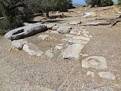 Die ummauerten Terrassen dienten wiederum als Brandopferstätten. Der Fels ist teilweise von den Feuern gerötet. In flachen Gruben wurden die Asche und die Reste der Opfergegenstände, wie Knochen, Keramikreste und Teile von Metallobjekten, gesammelt und mit runden Schieferplatten, die aus dem Grundgestein östlich des Heiligtums stammen, bedeckt, teilweise auch mit Tonscheiben. Unter einer der Schieferplatten entdeckte man einen Keramiktopf, der 94 Astragaloi von Ziegen enthielt. Die südwestlichen Terrassen hatten zunächst einen Zugang, der später durch eine Wand blockiert wurde. Im Süden dieser Opferstätten schuf man, wahrscheinlich im 6. Jahrhundert v. Chr., einen Eingangskorridor von Westen zum Gelände des Heiligtums. Nach einer Beschädigung des älteren oberen Gebäudes an der Ostwand durch eine Bewegung des nebenliegenden Marmorblocks im 6. Jahrhundert v. Chr. baute man es schmaler und mit einer Querwand wieder auf. Es diente nun als Nebengebäude, wahrscheinlich für die Herstellung von rituellen Mahlzeiten des westlich angrenzenden späteren Baus, in den eine u-förmig umlaufende Bank integriert wurde.