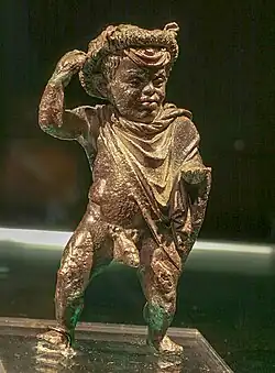 Die Figur zeigt einen mit Umhang und Haarbinde spärlich bekleideten Zwerg, der in leichter Rückenlage steht. Die ausgestreckte linke Hand hielt wahrscheinlich einen unbekannten Gegenstand, die rechte Hand führt zum lockenhaarigen Kopf. Möglicherweise stellt die Figur einen trunkenen Teilnehmer einer Kultfeier dar.